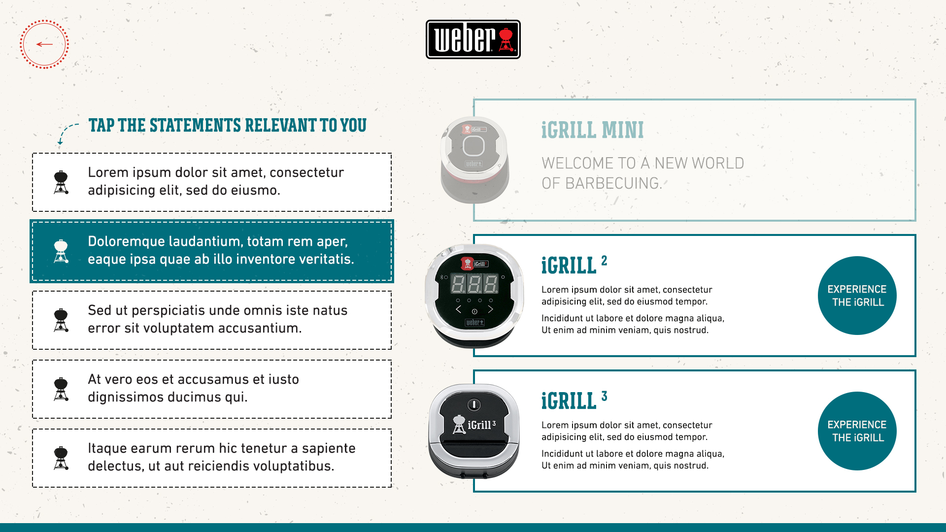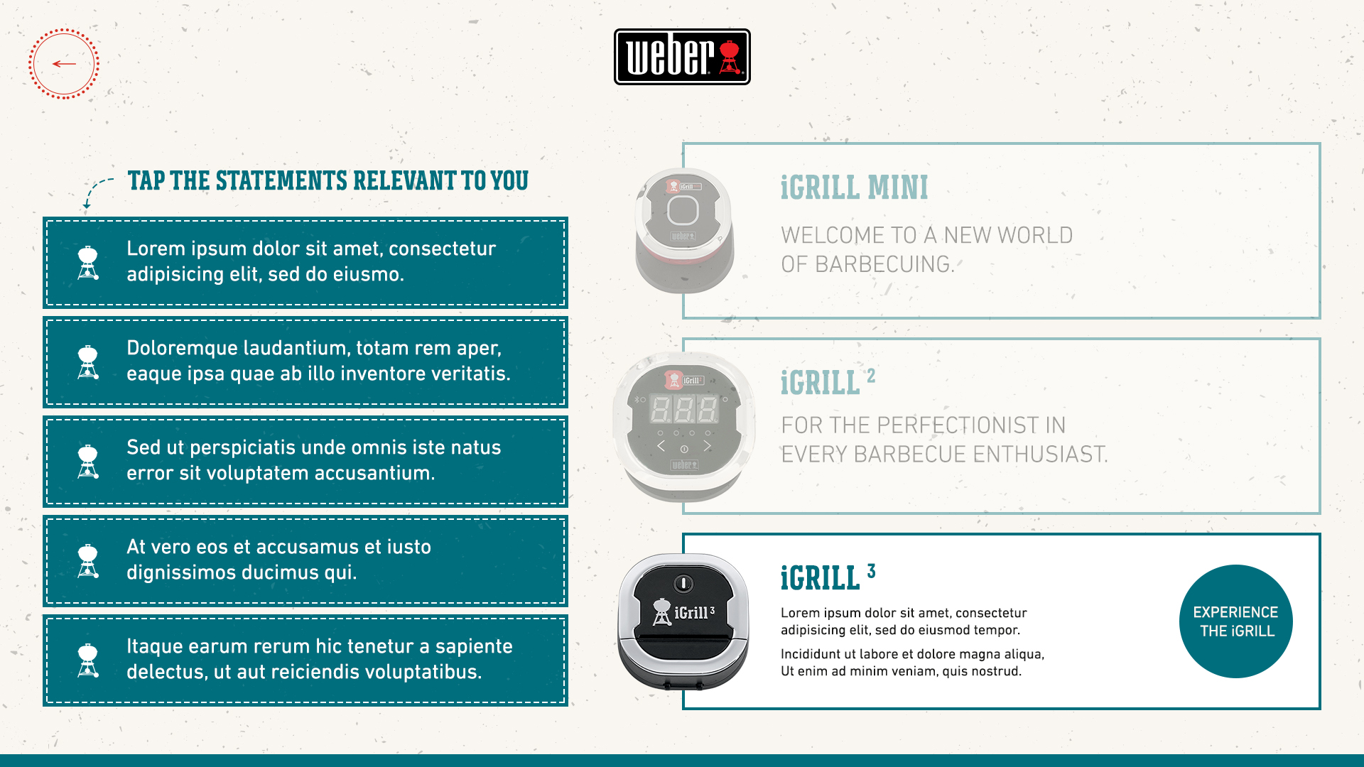 The product selector was a great screen that allowed customers to interact with the demo as if they were explaining to a consultant what their needs are. It allowed the customer to refine the products based on their BBQ habits and current equipment.